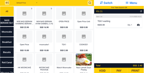 Start a sample order by selecting any food item. This will demonstrate how to void an active order.